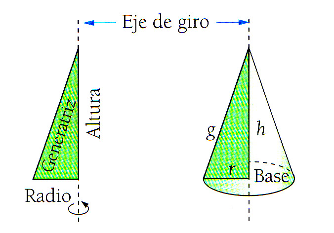 - Un cono es el resultado de hacer revolucionar un triángulo rectángulo sobre uno de sus catetos.